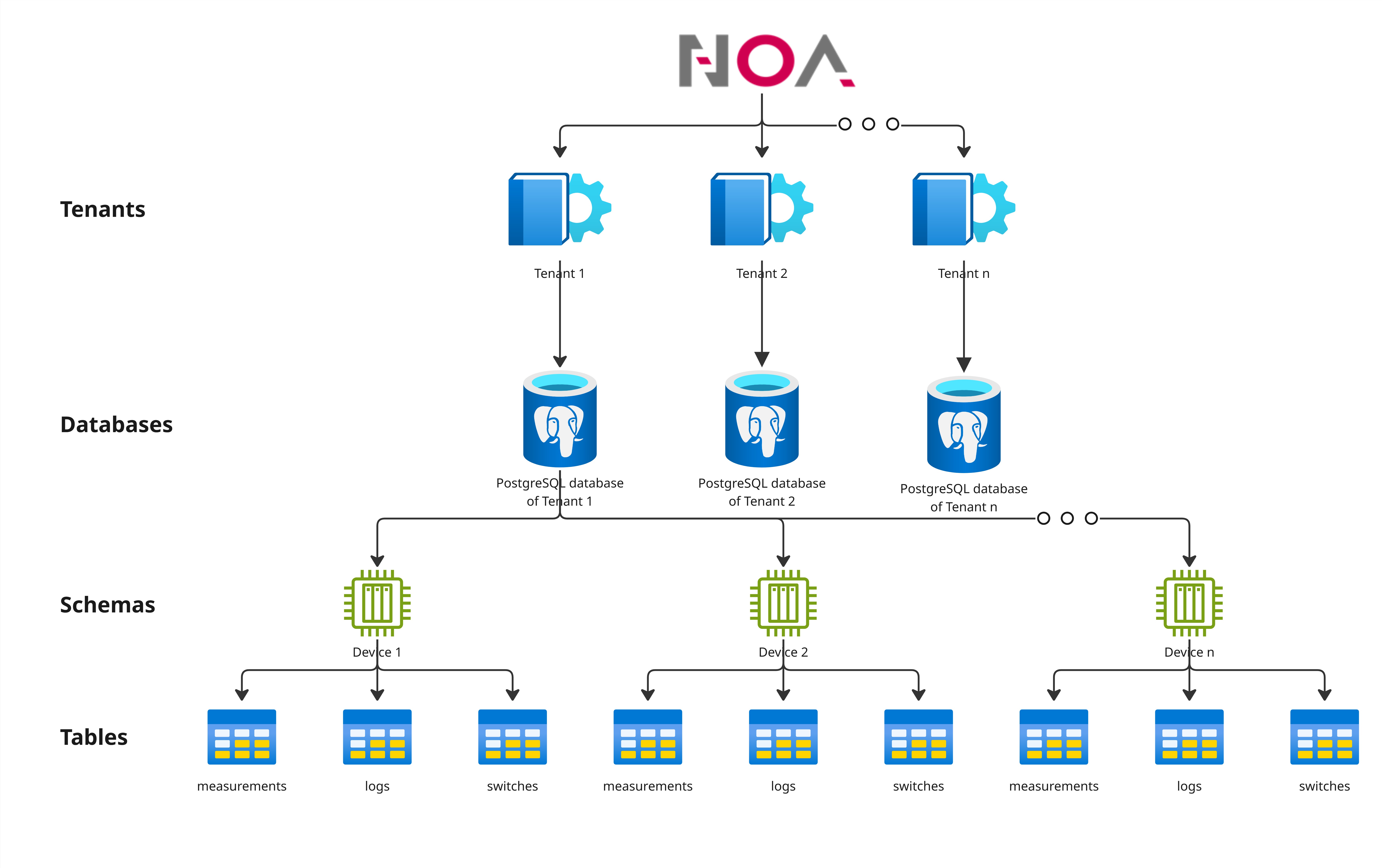 The database in NOA Portal that contains your device data is a PostgreSQL database. For each tenant, there is one database. This database consists of multiple tables depending on the number of devices in the tenant. The devices act as a schema in the database. For each device in the tenant, there are three tables: