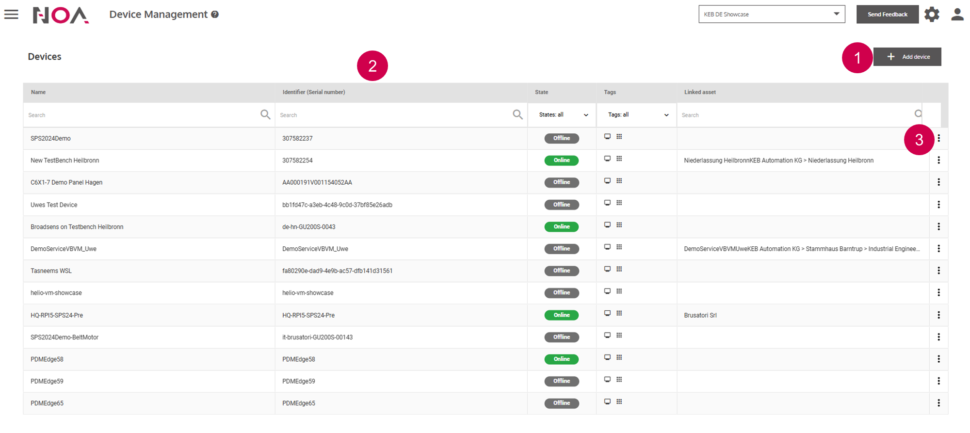 ReferenceDevice ManagementDevice TableOn this pageDevice Table About Devices that are registered to your Tenant are displayed in the Device Table. Here you can add new Devices or edit and delete existing Devices. Anatomy Add new DeviceSee information of your DevicesEdit or delete the Device