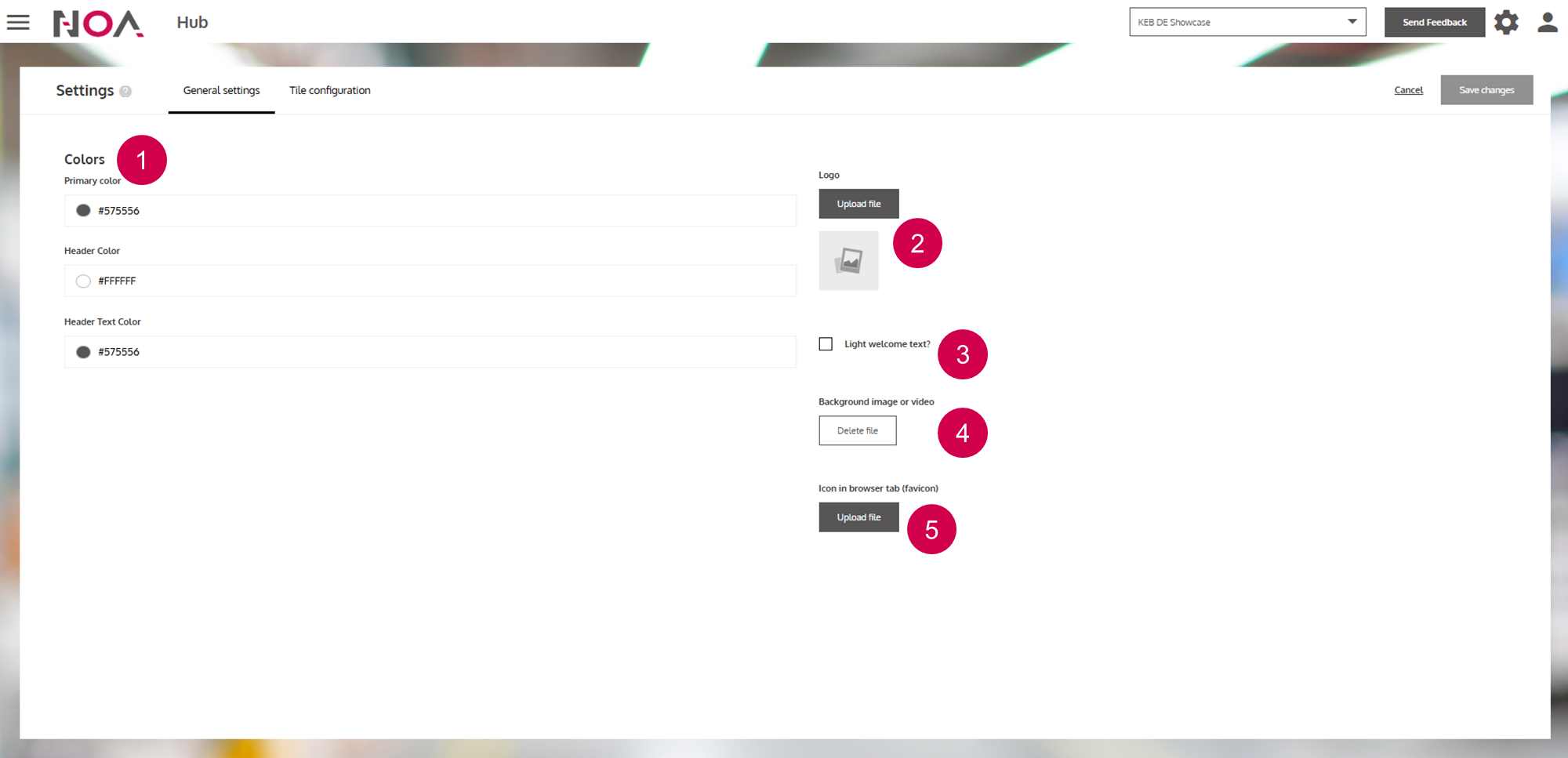 ReferenceHubHub SettingsGeneral SettingsOn this pageGeneral Settings About In the General Settings tab, you can customize your Tenant. You can change colors, logos, images and the Welcome Message. Anatomy Change colorsChange logo (top left)Toggle the color of the Welcome MessageChange background imageChange icon in the browser tab