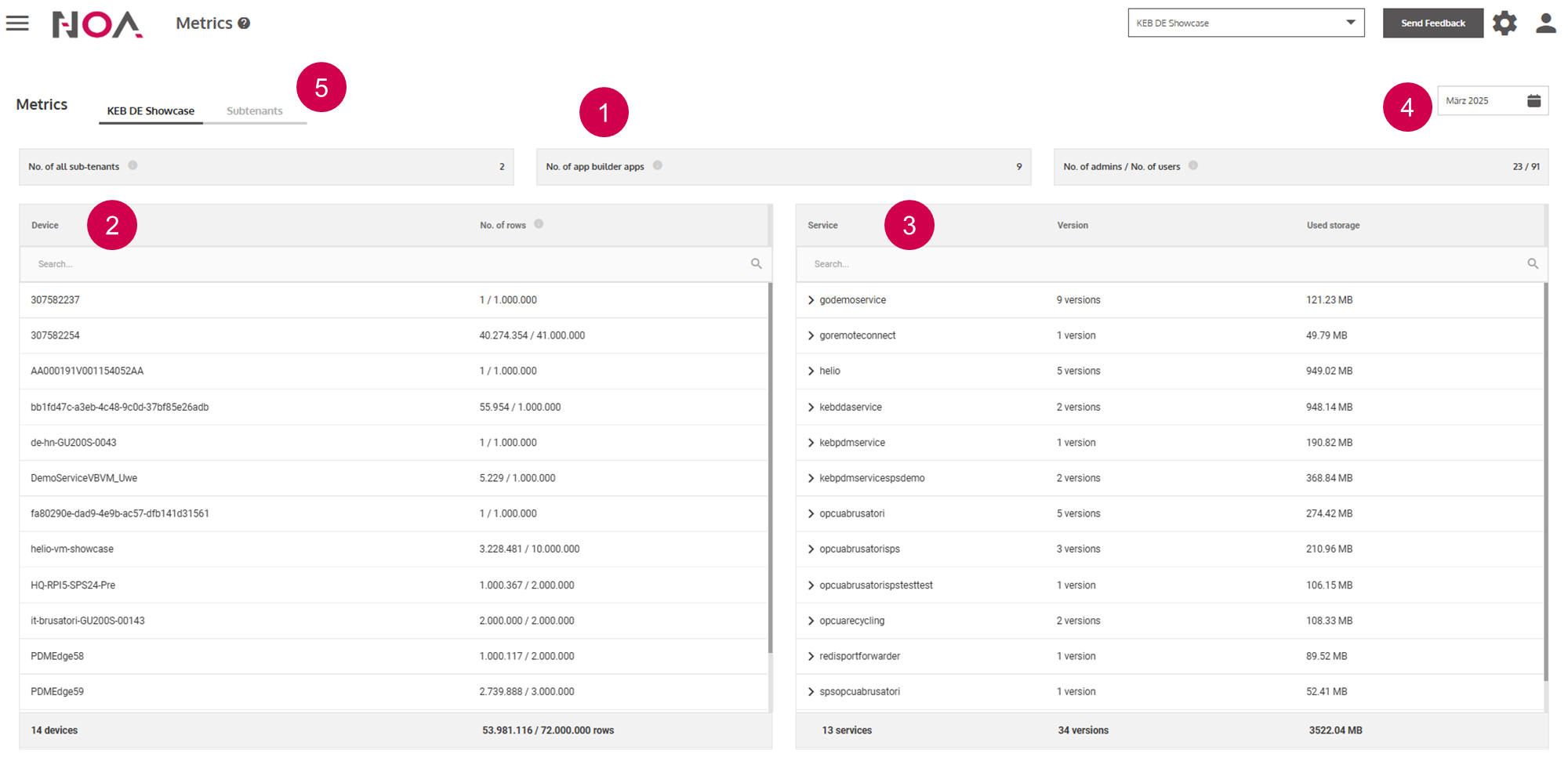 ReferenceMetricsTenantOn this pageTenant About Here you see all billing relevant information of your currently selected Tenant. You also have the option to select a month that you want to view the metrics of. Anatomy General metricsDevice specific metricsApp specific metricsChange time periodView metrics for Subtenants
